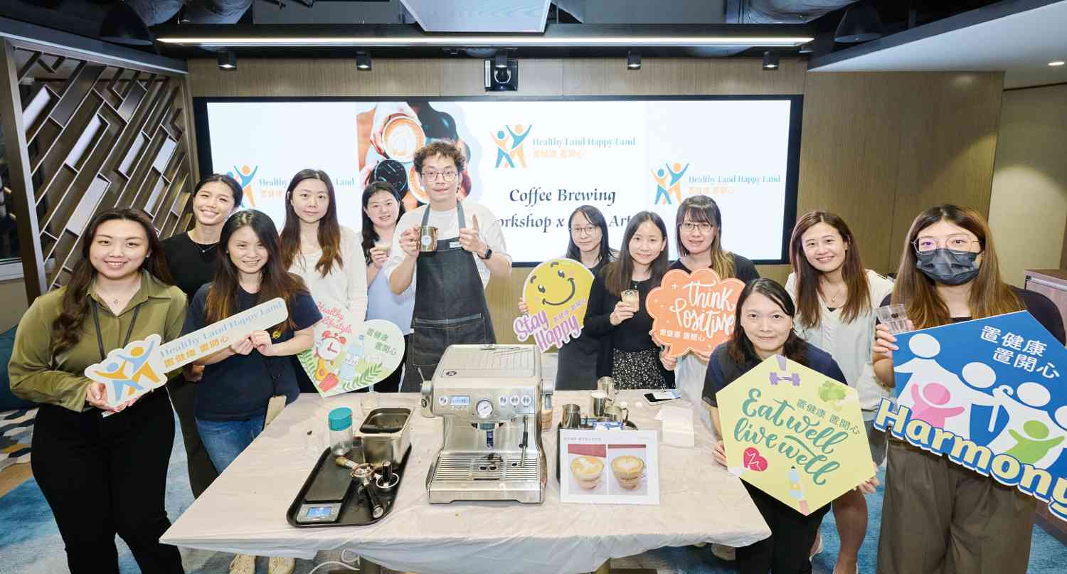002.jpg caption - 「置健康•置開心」定期舉辦活動,讓員工於繁忙的工作中抽空參加,促進身心靈健康。圖為「咖啡沖泡 x 拉花」工作坊