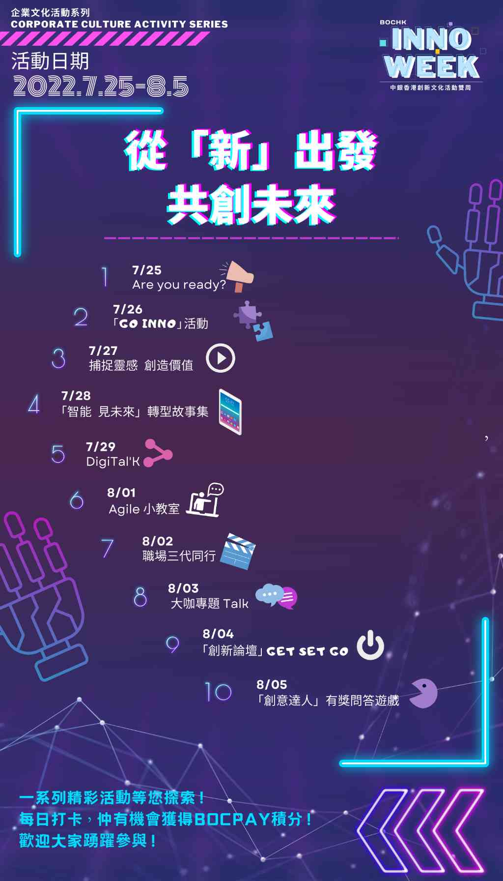 數字化轉型的實現需要集團上下一同參與,能否培育和運用創新思維,樹立起敏捷創新的企業文化是轉型實踐成功的關鍵所在。因此,中銀香港通過多形式多渠道方式開展創新文化的宣傳傳導,包括舉辦「INNO Week」創新文化活動雙周,活動期間每日推出短視頻、專家講座、問答遊戲等活動;制定數字化轉型培訓框架,推出「Go Digital 數字化轉型規劃五重講」系列培訓、專題線上課程、學習包等,加強員工對銀行數字化轉型戰略的認識與關注,鼓勵員工勇於創新實踐。