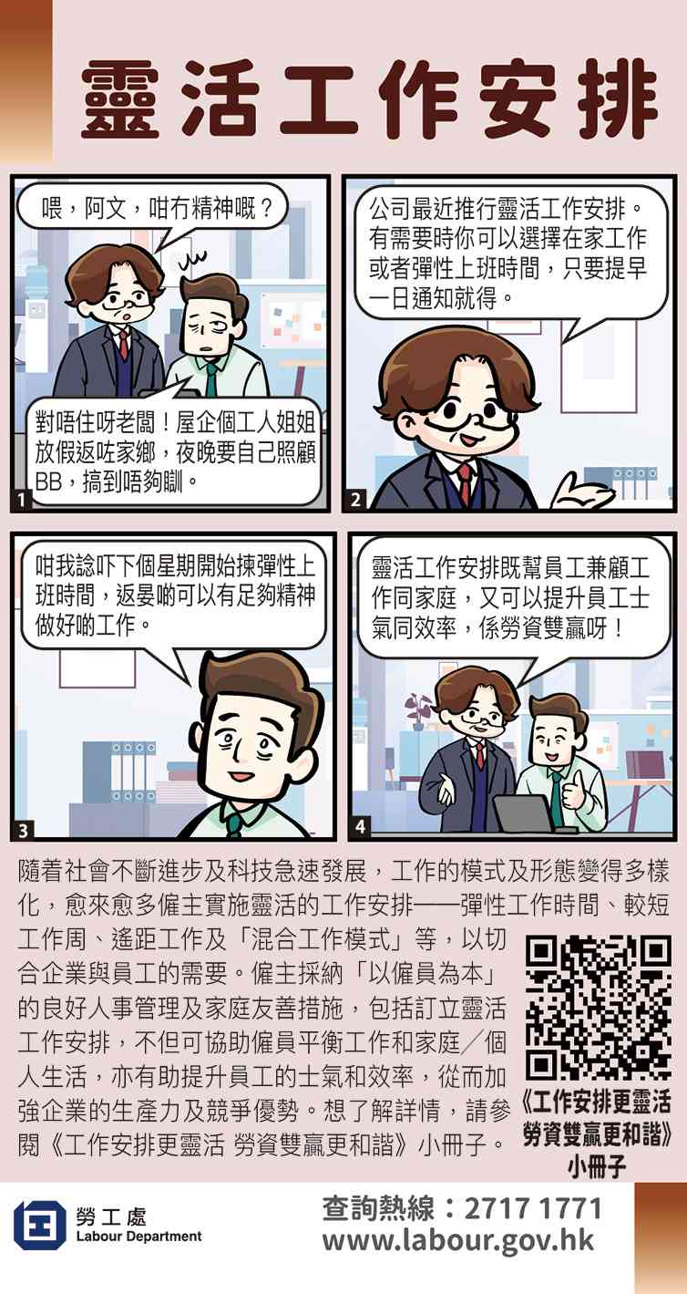隨着社會不斷進步及科技急速發展,工作的模式及形態變得多樣化,愈來愈多僱主實施靈活的工作安排——彈性工作時間、較短工作周、遙距工作及「混合工作模式」等,以切合企業與員工的需要。僱主採納「以僱員為本」的良好人事管理及家庭友善措施,包括訂立靈活工作安排,不但可協助僱員平衡工作和家庭/個人生活,亦有助提升員工的士氣和效率,從而加強企業的生產力及競爭優勢。