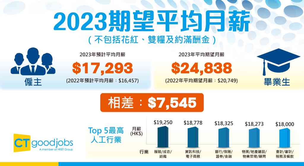 本港大型求職平台CTgoodjobs在本年第三季透過網上問卷形式,進行了《2023年畢業生薪酬及就業調查》。調查發現,畢業生的期望薪酬為每月港幣24,838元,比去年升約20%;而僱主願意支付的薪酬為每月港幣17,293元,比去年稍升5%,雙方期望落差高達港幣7,545元。