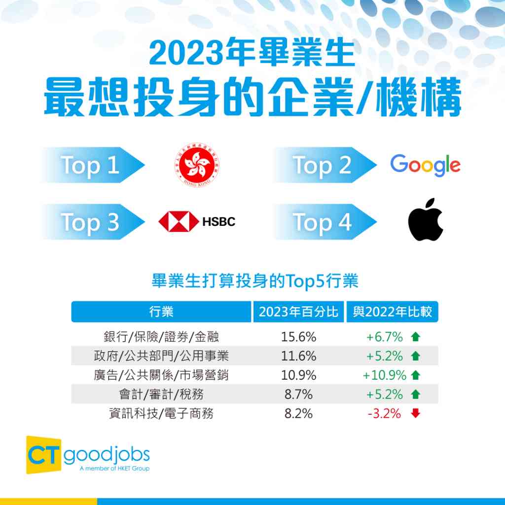 根據調查數據,最多受訪畢業生打算投身「銀行/保險/證券/金融」,比率達15.6%,其次是「政府/公共部門/公用事業」(11.6%)。至於去年最受歡迎的「資訊科技/電子商務」行業,今年三甲不入,僅有8.2%受訪者選擇。至於最受畢業生歡迎的就業機構是政府,佔整體8.5%,緊隨其後的是Google(6.0%)、HSBC(3.1%)及Apple(2.9%),可見大型企業或機構較吸引畢業生。