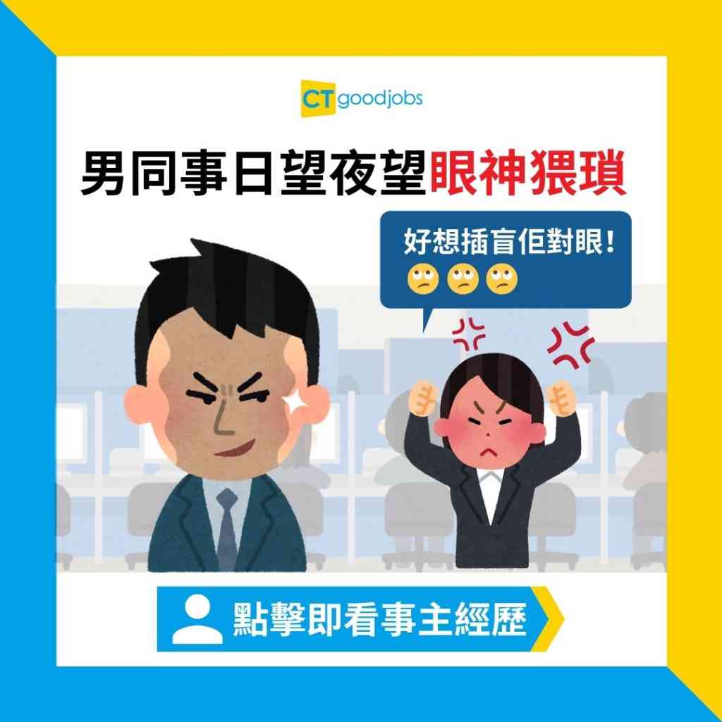 最近有打工仔投稿,指責公司男同事經常向她投以猥瑣目光,讓她十分不安,並怒斥︰「好想插盲佢對眼!」(按圖即看事主經歷)
