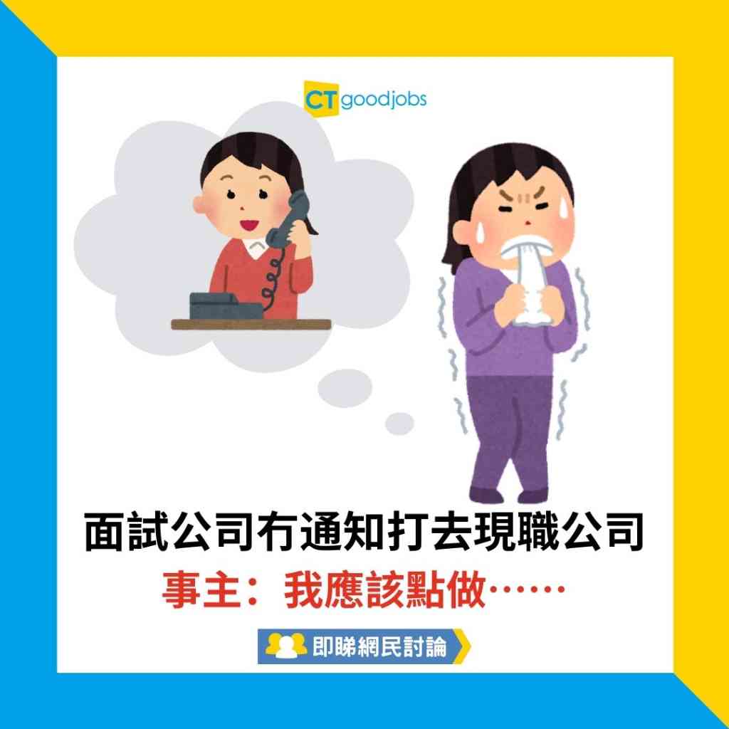 事主:「想請問大家有冇遇過喺仲返緊工嗰陣搵工,應徵嘅公司打電話畀現職嘅公司?今日我去面試嗰陣先發現,嗰間公司打電話畀我而家間公司,仲要冇事先問過我,我都冇填過而家公司嘅相關資料(只係履歷上面寫咗公司個名)。