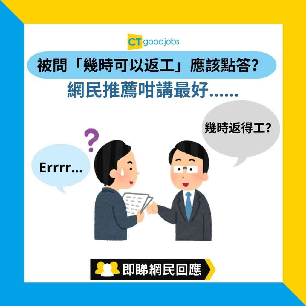 事主︰「如果我一次過Send咗CV畀好多間公司,其中畀人問『幾時可以返工』,我應該點樣答好啲?萬一我更鍾意啲未面試嘅公司咁點算?或者係面試嗰陣發現呢間公司唔係自己想要嘅公司呢?如果有啱啱Apply嘅公司未通知我去面試,我應該點答會比較好?」