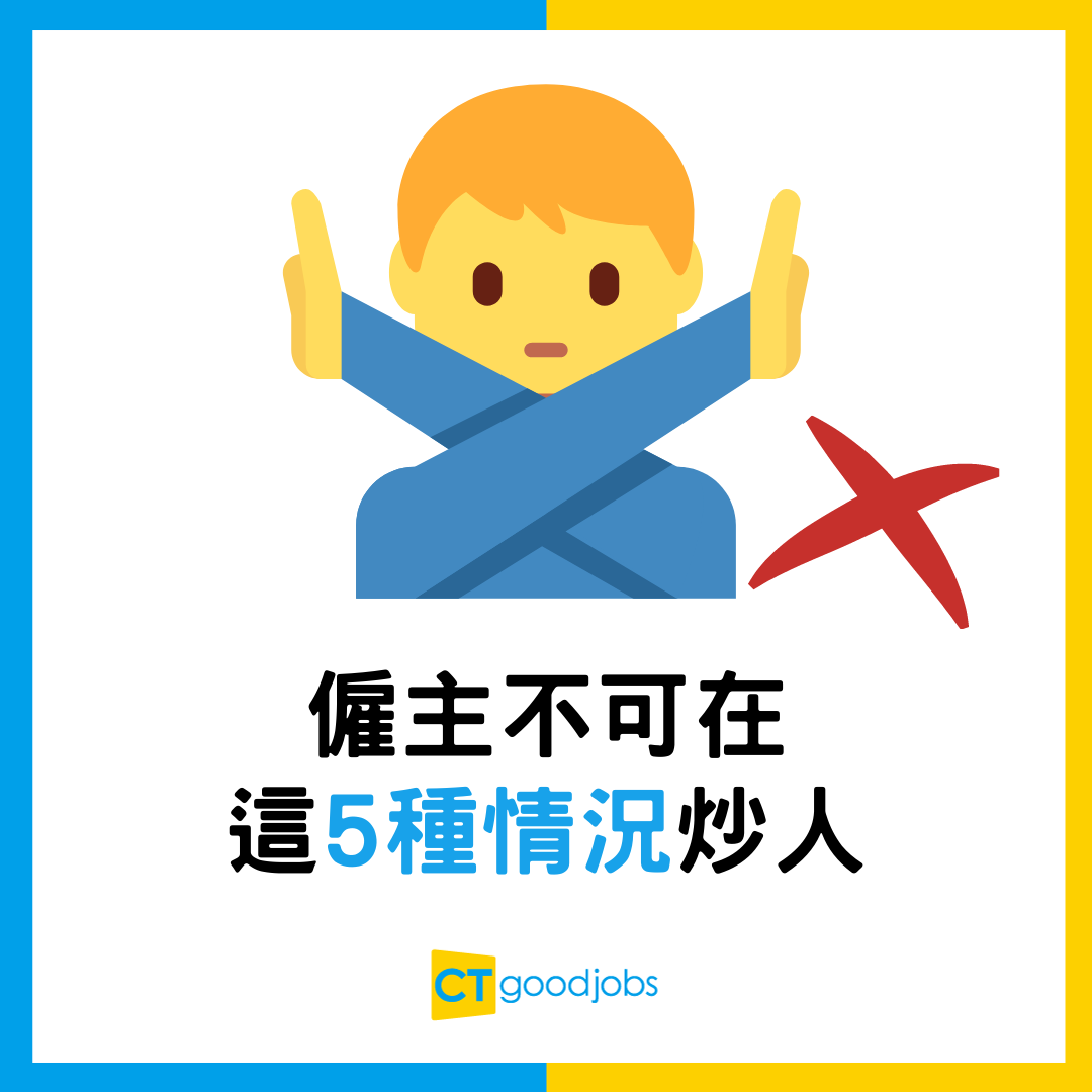 根據香港法例第57章《僱傭條例》第9章終止僱傭合約內說明,僱主不可在以下5種情況終止僱傭合約,按圖放大。