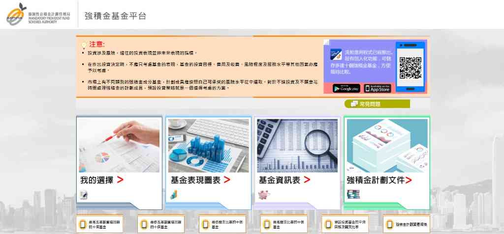 打工仔入職後須要填寫一份參加強積金計劃表格,向強積金受託人作投資指示。當選擇計劃內強積金基金時,就要知道不同基金的表現。計劃成員可以透過「強積金基金平台」,逐項比對每隻強積金基金的資訊。平台詳列各項基金資料及表現,平台更提供了不同「排行榜」,如「最低五年期累積回報的十個基金」、「最高開支比率的十個基金」、「最高五年期累積回報十個基金」和「最低開支比率的十個基金」,讓計劃成員更容易比較基金回報及收費,積極管理強積金,為未來退休保障做好準備。