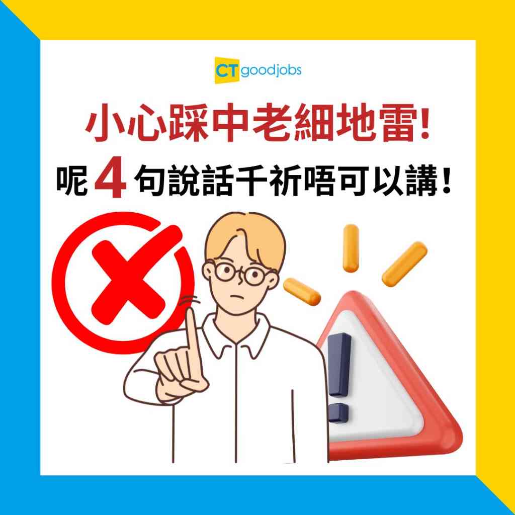 要在職場上安然地生存,工作能力固然重要,但人情世故亦是打工仔的必修課。學懂與同事和諧地相處、「湊掂」老細,都是打工仔必須要具備的技能。大家又知道自己老細的底線及地雷嗎?小編為大家整理了4句職場的地雷說話,小心衝口而出惹怒老細呀!