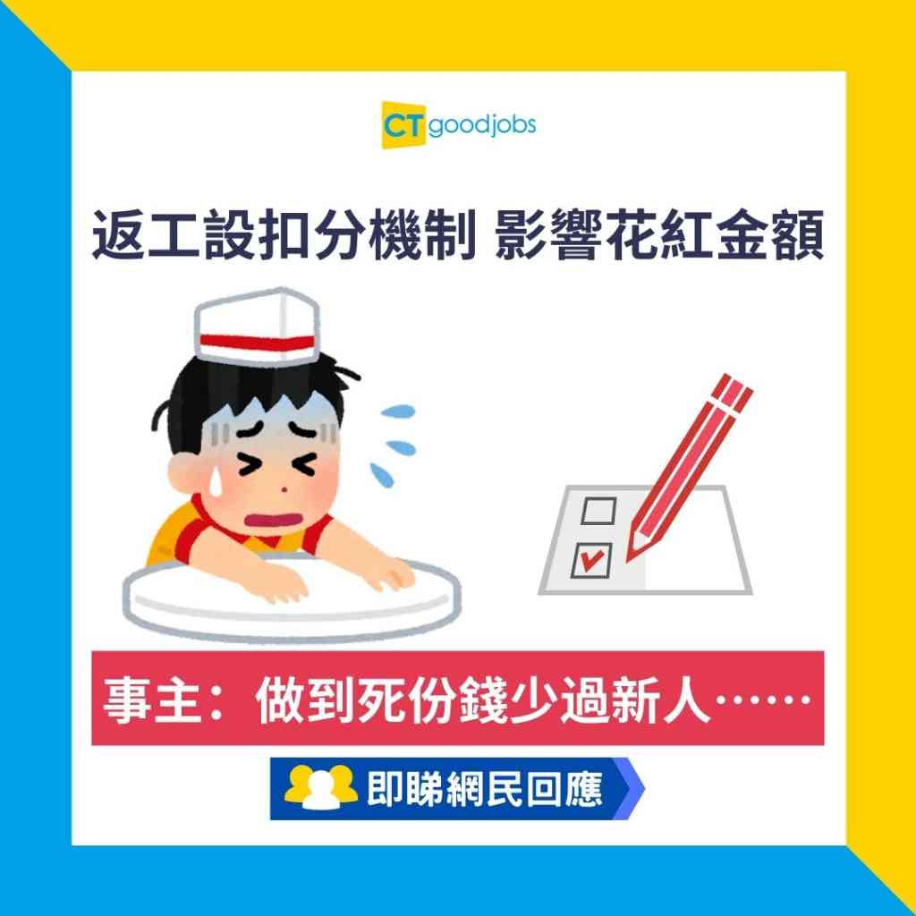 「我而家份工都做咗就嚟半年,默默變咗最資深嘅員工,要做嘅嘢都越來越多,偶爾仲要做埋安排人手嘅嘢,明明我個位係外場職員,而且每日都返朝十晚十,中間休息一個半鐘休息時間,雖然個老闆都好肯畀OT錢,但有個好奇怪嘅地方,就係公司有個扣分嘅機制。