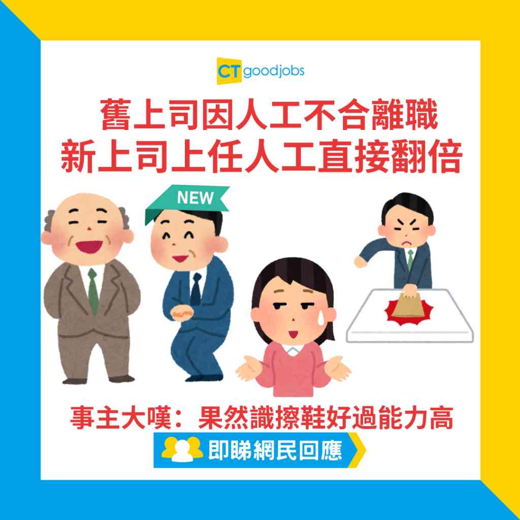 事主:幾個月前舊主任因為太低人工辭職,當時上司同佢傾咗好耐,最後只係肯加少少人工畀佢,同舊主任達唔到共識所以辭職。之後嚟咗個新嘅主任,人工同舊主任走嗰陣一樣。點知一過試用期就升職加人工,人工仲係以前舊主任想要嘅,差唔多加咗幾倍咁滯,聽到真係好無言……
