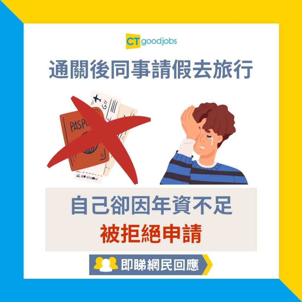 近日有網民在討論區發帖文,分享在通關後眼見同事們紛紛請假去旅行,正當自己也希望出國放鬆心情,重拾旅行快感時,他所遞交的放假申請竟然不獲批准?!一問之下,才知道因為自己只有半年多工作資歷,公司規定不允許該年資的員工申請連續兩天或以上的假期。