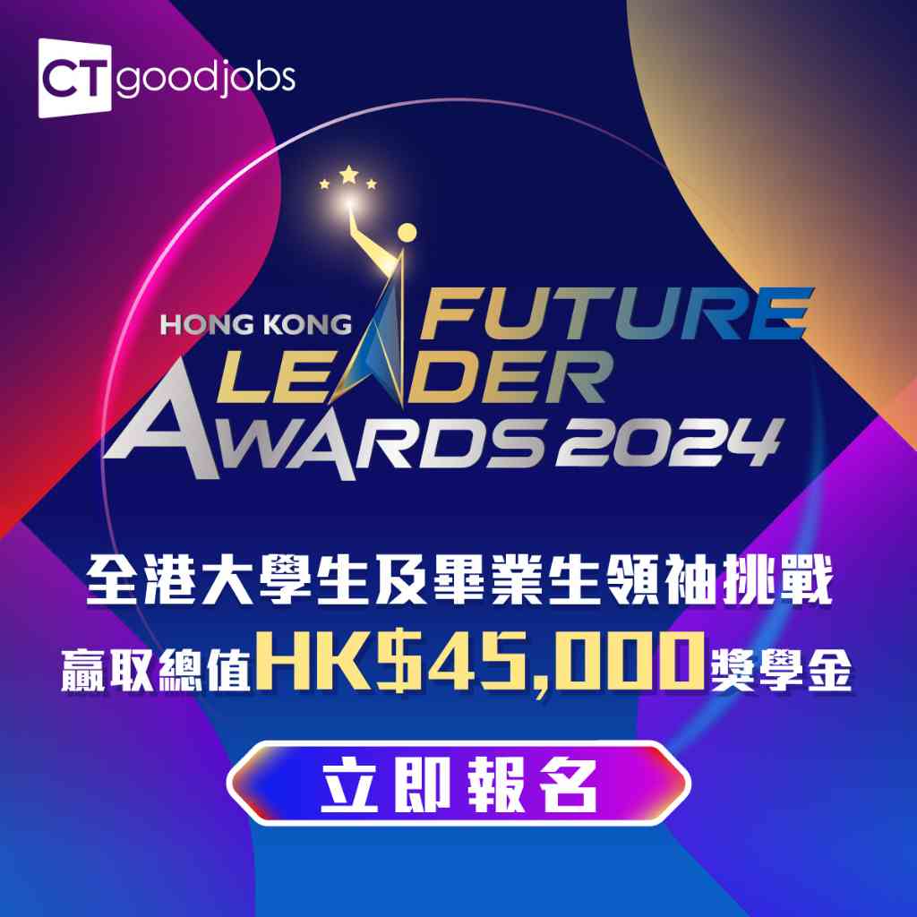 CTgoodjobs向來重視培育未來人才,每年舉辦《CTgoodjobs Hong Kong Future Leader Awards》,邀請不同行業的成功領袖及人力資源專才,助大學生及職場新鮮人裝備未來技能,為投身職場作好萬全準備。2024年,《CTgoodjobs Hong Kong Future Leader Awards》活動現接受報名,假如你有興趣與各大大學學院的大學生較量,不妨一起參加是次活動,勝出參加者除了最高港幣$30,000獎學金,更有機會到著名企業進行工作體驗,由行業專家親身指導工作。