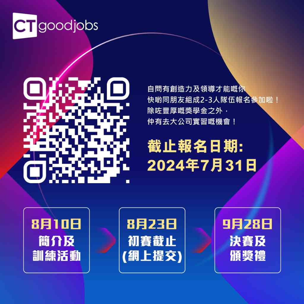 CTgoodjob舉辦《CTgoodjobs Hong Kong Future Leader Awards》,旨在透過表彰在人工智慧和技術領域表現傑出的年輕人才,希望能培育香港年輕一代成為「未來領袖」。今年活動以「Lead the future in the age of AI」為主題,由即日起至2024年7月31日接受報名,歡迎任何學科之大學或大專院校學生、畢業生及職場新人,以團體(2至3人)的形式參加。
