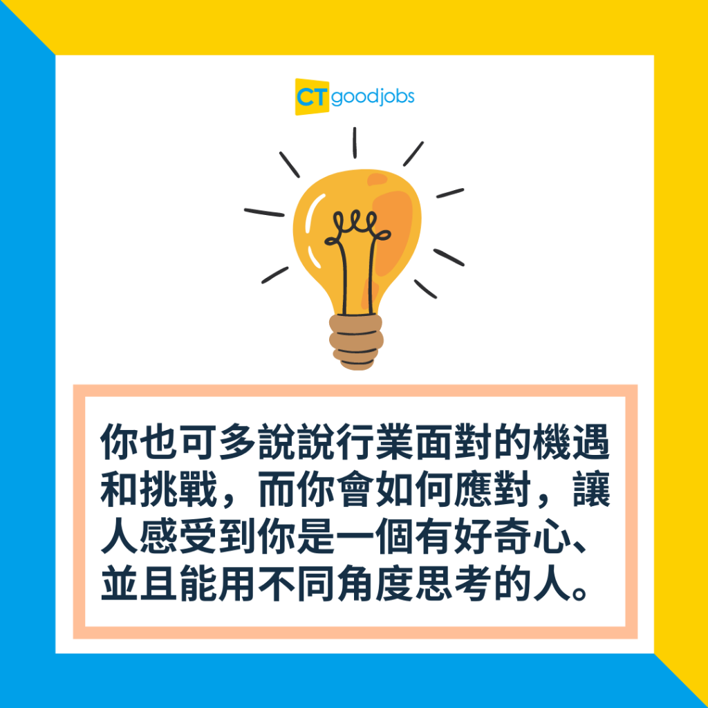 這回答一來可以表現你有做足功課,對公司有充分了解,知道其發展方向及產品等;二來可以表達對行業前景的認可,印證自己並非騎牛搵馬,願意投放時間心機在工作上。
