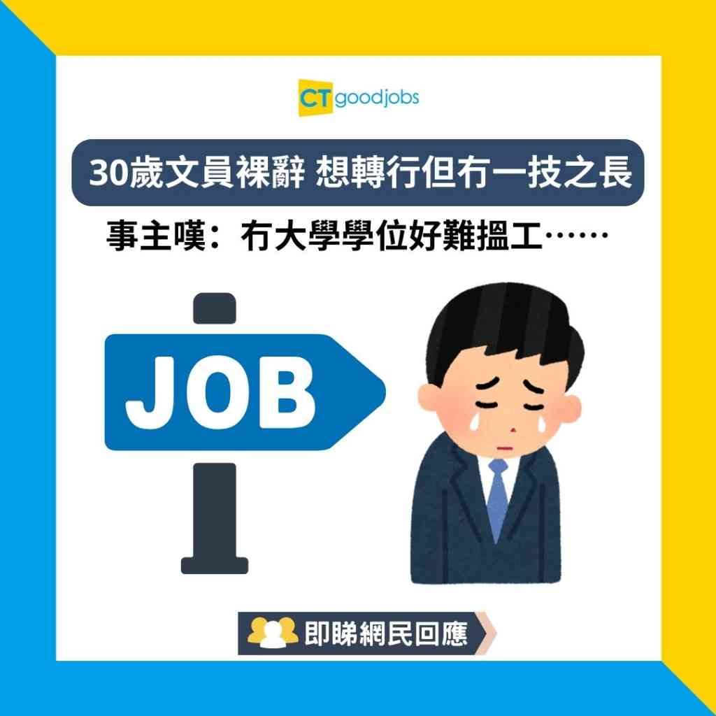樓主:人到30歲發覺自己冇一技之長,對上一份工係返銀行文員仔,最近因為某啲原因祼辭。發覺原來冇大學學位好難搵工,想轉行又唔知轉咩好。網民A:裸辭得嘅就繼續放吓假先囉。