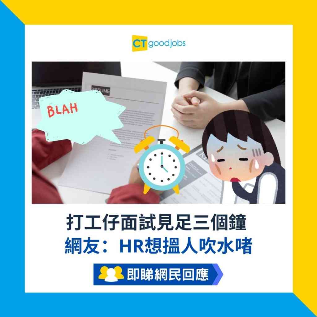 網民:「我以前有份工都試過in了大半日(成個下午),由兩點開始,in完以為走得,但對方話個Team Head想in埋,中間等了一陣再同Team Head in,,最後走得嗰時好記得幾乎6點。最後豪啲坐的士回家算,(因為成身西裝好辛苦)。 最後有請不過當時搵到另一份比較喜歡的所以無做。」
