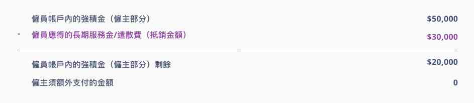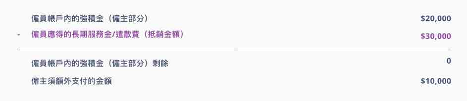 根據現行法例,僱主可利用僱主為僱員作出的強積金供款所產生的累算權益,抵銷向僱員支付的長期服務金/遣散費,但須注意的是,僱主可從僱員帳戶抵銷的款額,不應多於向他們支付的長期服務金/遣散費款額。換言之,如僱主供款所產生的強積金不足以全數抵銷長期服務金/遣散費,他必須向僱員支付不足的餘額。另外,如僱主供款所產生的強積金多於長期服務金/遣散費款額,在抵銷後所剩餘的款額必須保留在僱員的帳戶內,並歸屬於僱員。詳情可參考以下例子: