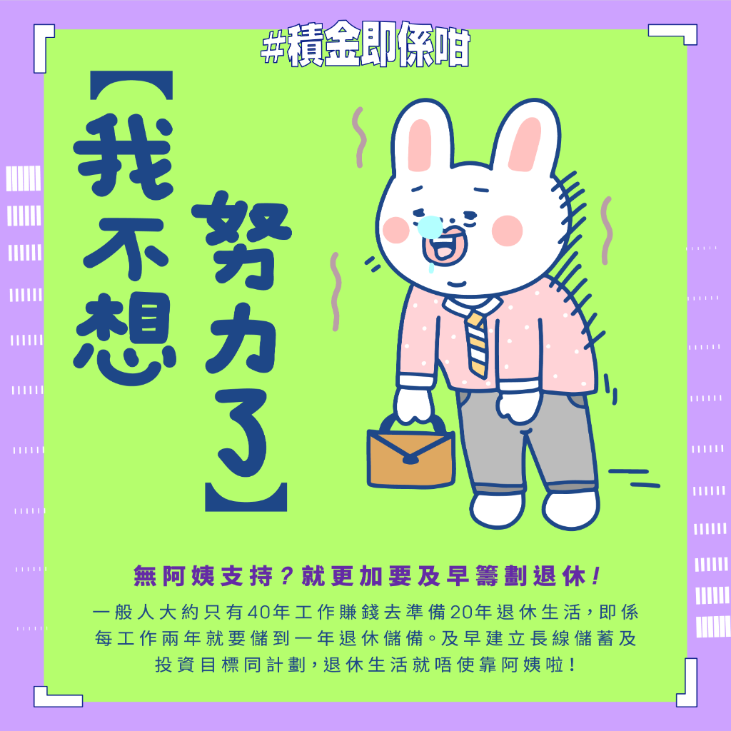 首張登場的潮語咭是「我不想努力了」,提到一般人大約有40年工作賺錢,準備接着20年的退休生活,即每工作兩年就要儲蓄一年的退休儲備,所以大家一定要及早建立長線儲蓄及投資目標,好好規劃退休生活,不要指望有「阿姨」可以代勞。