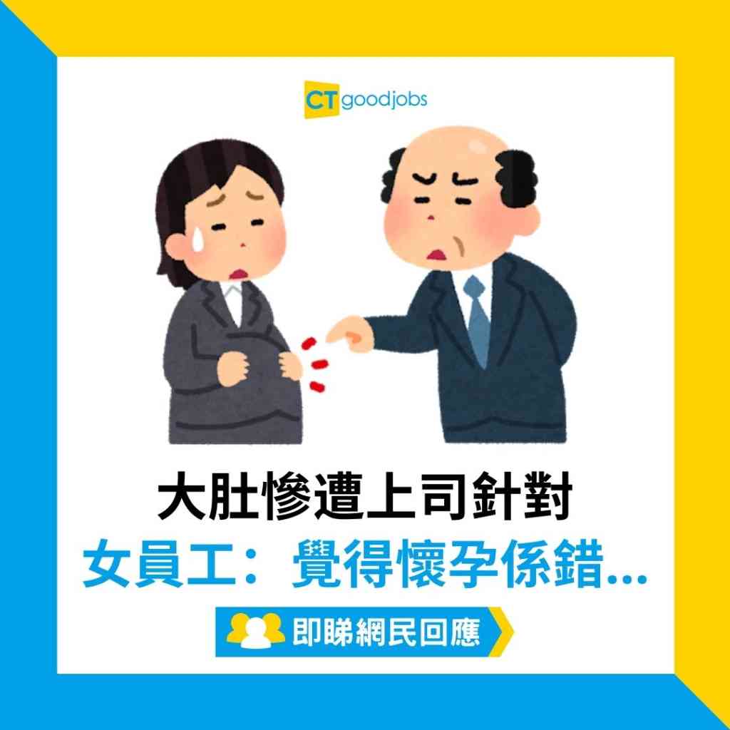 有網民在社交平台專頁「奴工處」上以「點解要針對?」為題投稿,分享自己懷孕上班的慘況,「其實有咗之後,我都好畀心機繼續返工,但老闆依然處處針對,講說話畀我聽,依家返工佢一叫親我,我就會手震心跳得好快,唔知佢下一秒係咪就會開口鬧我。同事做錯佢一句唔緊要就算,我一做錯就會鬧我,鬧到成個office都聽到。真係有一刻覺得自己懷孕係錯,已經見緊精神科。」