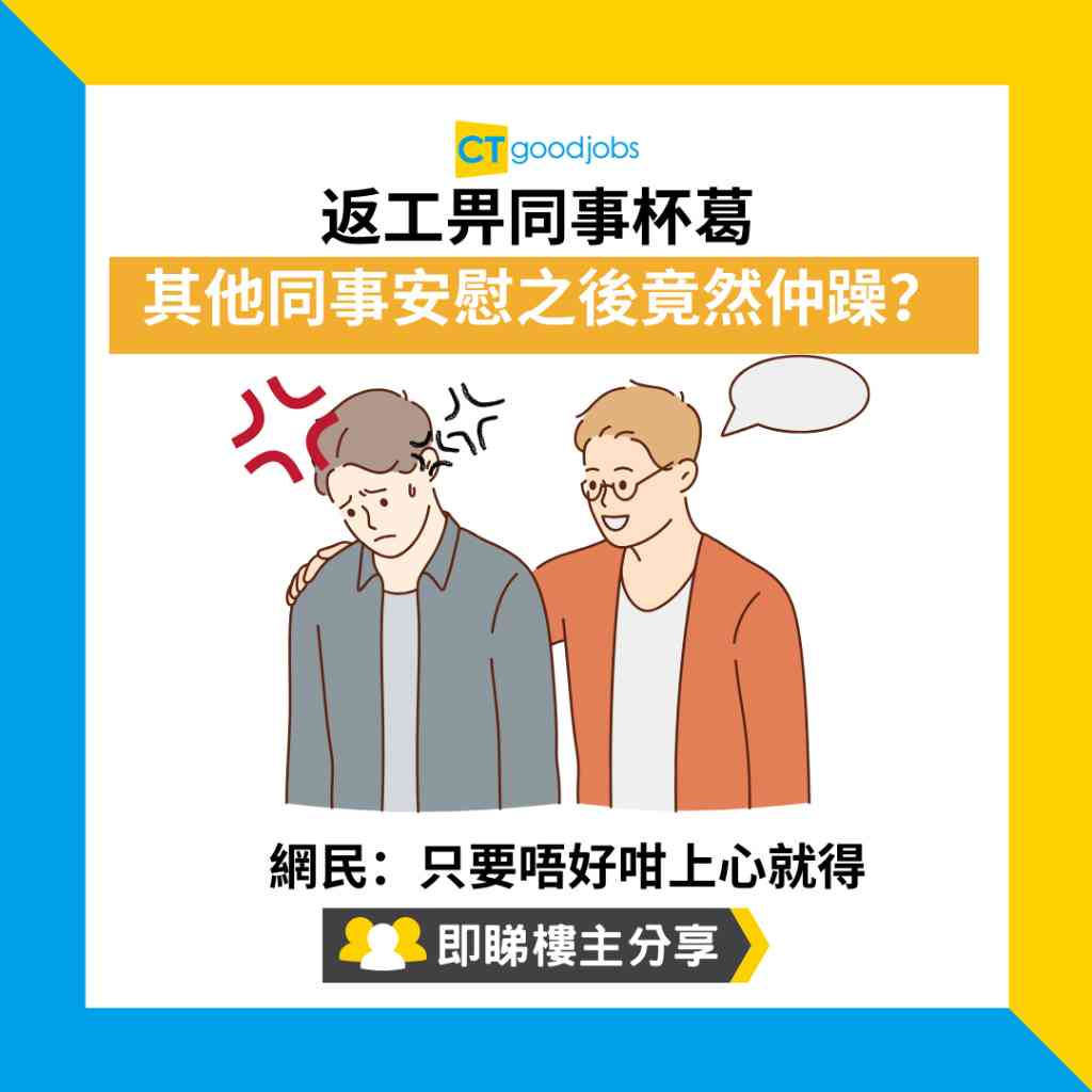 近日,有網民於連登討論區發文,指自己遭到某幾位同事杯葛,有其他同事上前安慰,鼓勵事主盡快調整心情,但事主聽完後竟感到更加憤怒和失落,向網民大呻苦況。