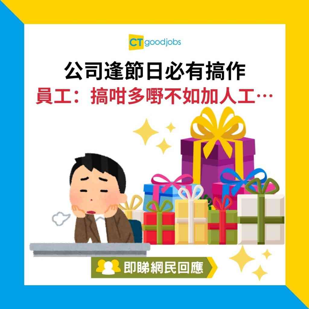 大時大節時,大家的公司會為員工做點甚麼嗎?新年有開工利巿、之後有春茗、情人節派朱古力、端午節請大家食糭、中秋節送生果和月餅券、聖誕節有抽獎⋯⋯看似是不錯的福利,不過原來有些打工仔對此並不太欣賞⋯⋯