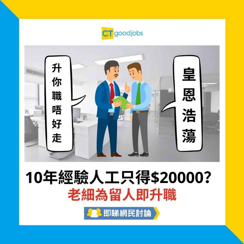 在職場上有種迷思,就是年資越久,薪酬理應越高,但現實卻不會如此理想。有時候升職加薪說的是實力與際遇,並不是在一間公司服務越久,薪金就會隨之跳升。有打工仔於香港討論區分享,在公司服務十年,由最初薪金$14000跳升至現時的$20000,已經感到意興闌珊,正當想離職時,老闆卻要升職希望他留下,令事主忍不住說句,「乜咁皇恩浩蕩啊。」