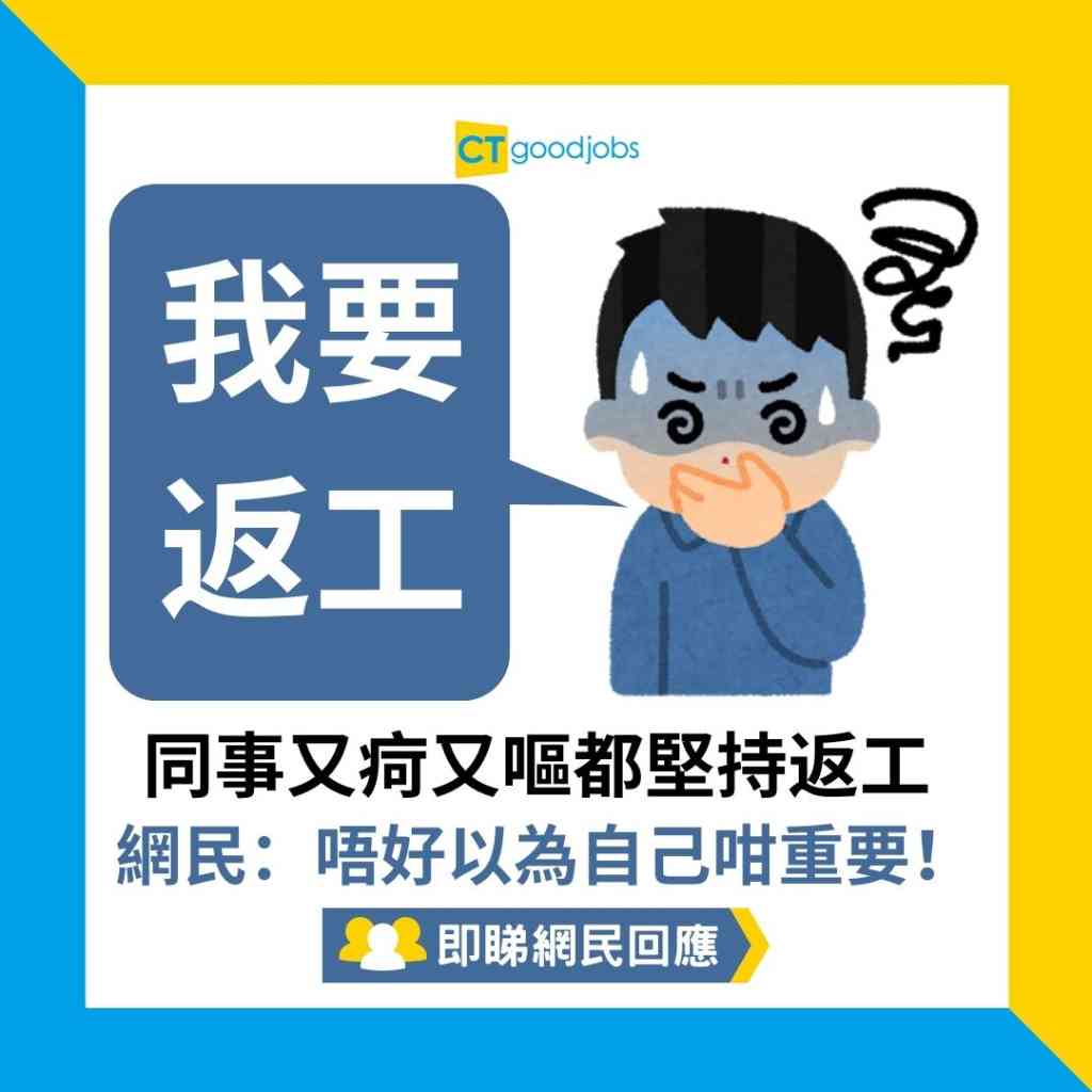 怎樣都好,有病就應該請病假,若勉強回公司,又會增加大家患病的風險,自己又辛苦,百害而無一利,有網民指:「唔好以為自己咁重要,冇人話冇咗邊個係唔得的。」自視過高亦是一大原因,要記住公司不會因為沒有了你就運作不了,只要明白這一點,就請好好休息。