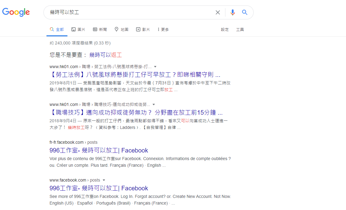 另外,有網民在網上搜尋引擎Google中輸入「幾時可以放工」,豈料Google搜尋結果引導網民是否搜尋「幾時可以返工」,該網民笑指香港人喜歡返工的程度,已計入「Google大神」的演算法中,或許同時證明了失業潮下香港人對工作的渴求。