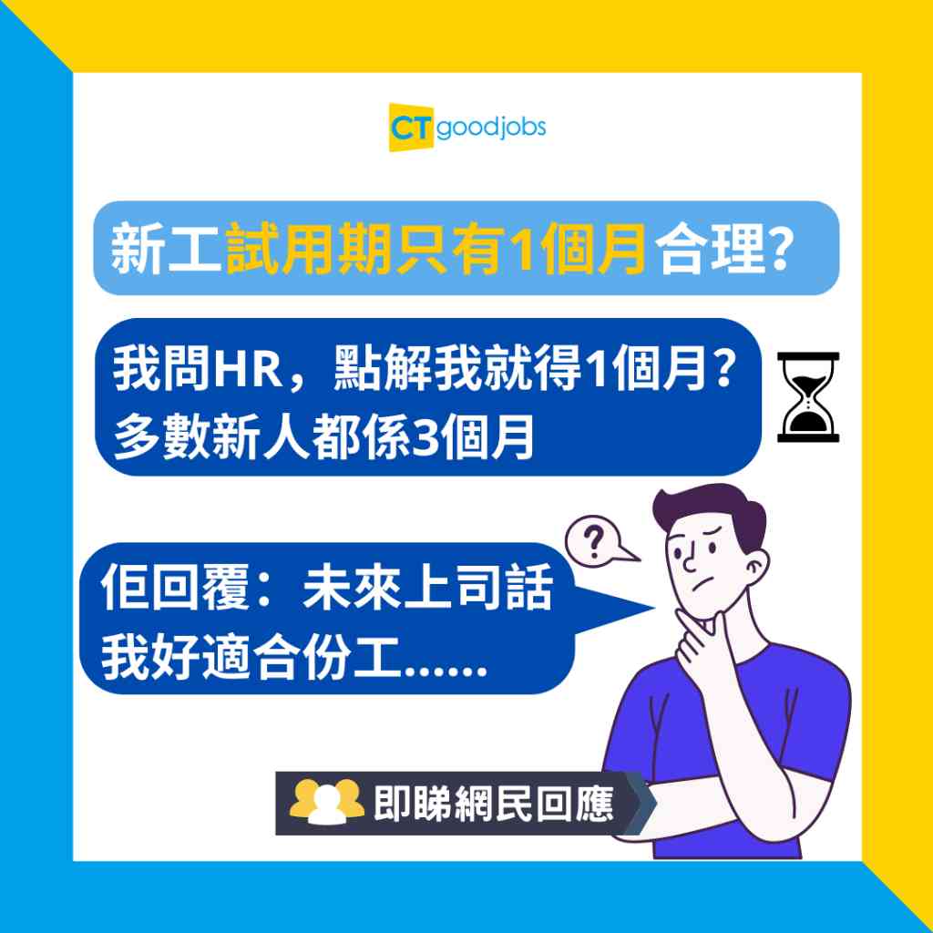 網民I:咁多公司試用期3個月係有原因,頭1個月畀新人熟習環境,第2個月熟習技能,第3個月試真章。個人認為1個月對雙方都唔太夠,除非你話同人哋好熟或者食回頭草,咁就另計。