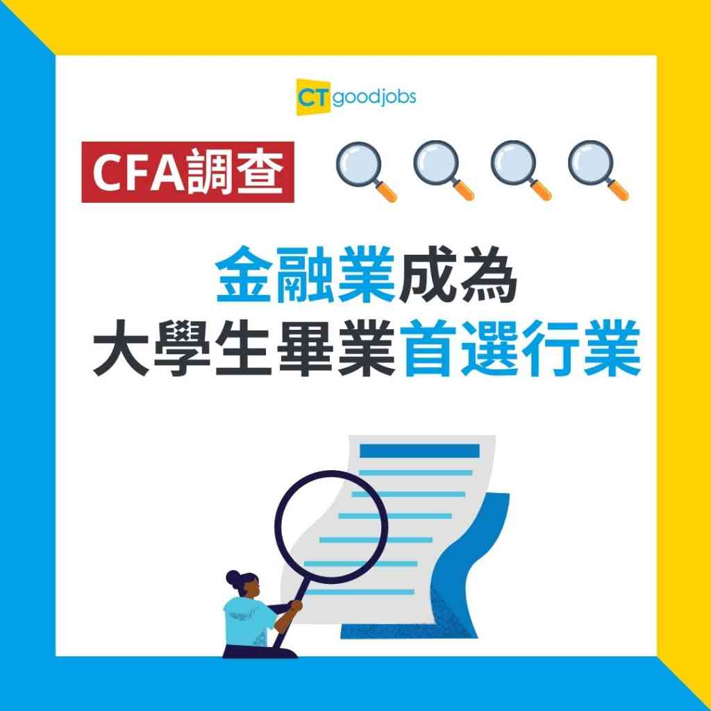 CFA《2023年全球畢業生展望調查》是委託調查機構Dynata在2023年4月12日至24日向9,437名年齡介乎18至25歲、修讀學士或以上學位或在過去3年獲得學士或以上學位的受訪者進行抽樣調查。對於首選的行業,29%應屆畢業生在就讀大學後,認為金融業是大學畢業後的首選行業,其次是資訊科技(25%)及醫學(21%)。最具吸引力的就業選擇,是有近三分一(32%)香港畢業生選擇的政府部門,遠於全球平均值17%。