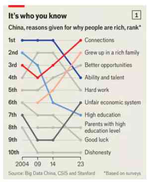 《經濟學人》援引美國學者Scott Rozelle以及Martin Whyte的研究顯示,中國人的致富觀念變化,簡單可以概括為「能力論」向「背景論」轉變。