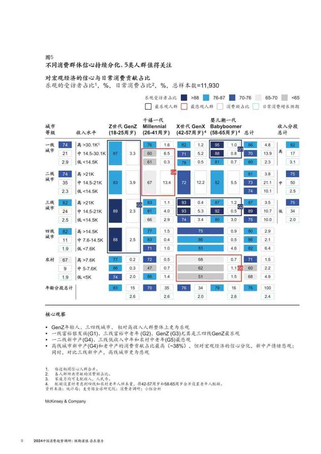 同樣是麥肯錫在2024年的中國消費趨勢調研顯示,中國內地的不同群體之間,消費信心已經開始分化。一二綫城市新中產為最為悲觀的群體之一,樂觀受訪者佔比僅60%,普遍擔憂房價帶來的資產貶值、高失業率以及不穩定的經濟形勢;城鎮Z世代年輕人則認為未來收入將會增長,對宏觀經濟以及家庭財務狀況相對樂觀,樂觀受訪者佔比普遍高過80%,三四綫城市的Z世代年輕人樂觀佔比接近9成。