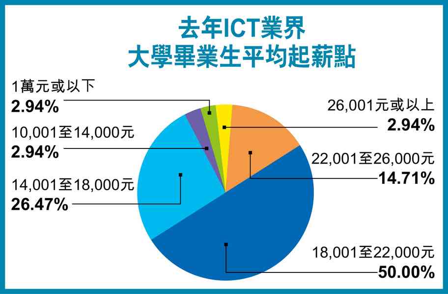 此外,根據調查顯示,近5成半受訪公司在2021年聘用應屆主修ICT的畢業生,近7成的入職薪酬超過1.8萬元;當中約18%公司的入職薪酬,更高達2.2萬元或以上。在入職ICT相關工作3年後,有近6成公司的員工,其薪酬已較入職時升超過10%。有2成公司表示,在入職後5年,其薪金增幅可高於50%。