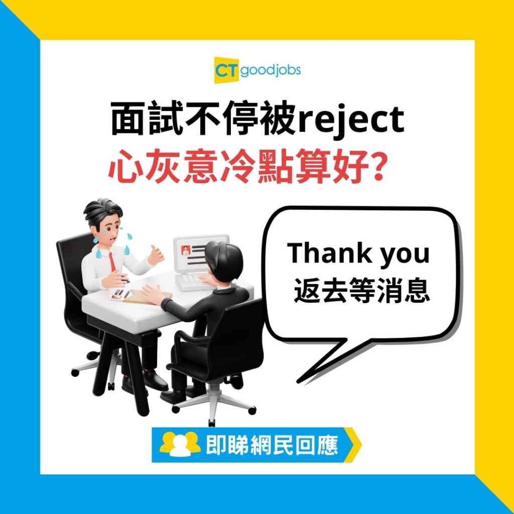 網民:「其實有interview本身已經代表份CV符合一間機構嘅要求,所以你嘅客觀條件應該係冇問題。Interview過程中被reject嘅原因,更大機會係推銷自己嘅時候出現問題,可能係講得太多buzzwords,太少實例之類。面試策略上嘅原因而畀人reject,面試策略係一樣你有能力決定嘅事,並且每次面試都係獨立事件嚟。總結完經驗同埋調整一下,相信下次表現會更加好㗎!」