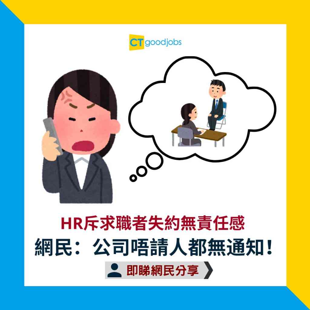招聘人手時,人力資源從業員(HR)從編制招聘廣告到與求職者正式面試的程序,都要花盡心思,務求找到最適合工作崗位的人選。在網上討論區Dcard有台灣HR分享自己的故事,指經常遇上求職者無預警的失約,讓他感到不忿,直斥求職者無責任心,網民不禁反駁:「即使不獲公司聘請,求職者也不會收到通知!」