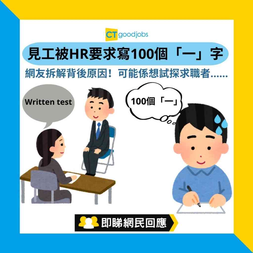 有網民自言,曾經被應徵的公司要求,從數字「1」順序寫到「300」,為了得到工作他只有照做。對於寫100個「一」的測試,有網民笑言,若然工作如寫「一」字般輕鬆,不要說是100個,寫1000個「一」字也願意。