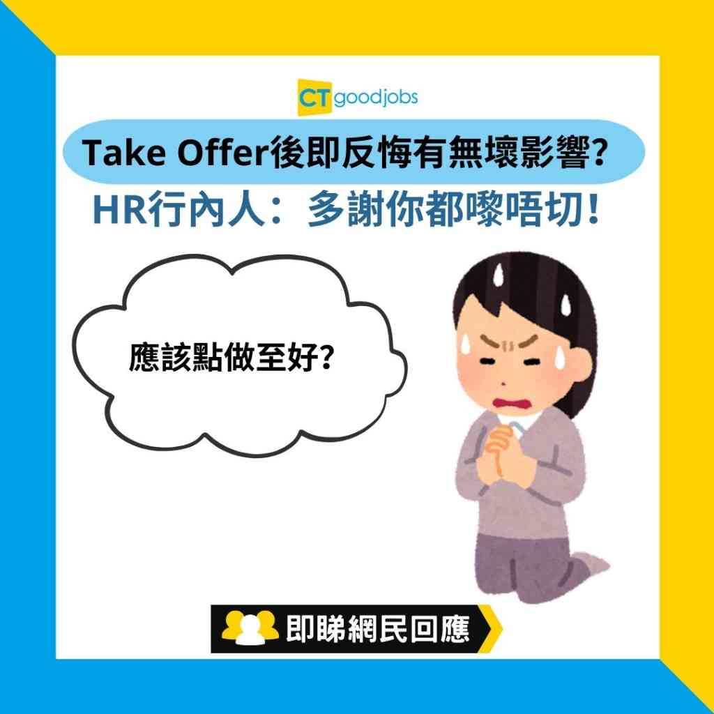 「我回覆咗某公司嘅錄取通知,但同時出現更好嘅Offer,可唔可以反悔?我上星期收到一間行銷公司嘅錄取通知,我馬上回信話可以即刻報到,但隔日我就收到另一間公司嘅Offer,嗰間公司係我最想去嘅,而家我就陷入兩難局面,想嚟HR版面問一問,咁嘅情況下,我可唔可以反悔,反悔有咩不良影響?」 網民回應: A/能力與資質好,當然有資格揀嘢做,而唔係份工揀你,但前提係唔可以當日至講,可以的話當然越早越好 B/老實說,等對方可以排候補嘅人選上嚟,佢好多謝你早啲講C/當然可以,不過要話,唔好報到嗰日先嚟玩失蹤,我自己嘅經驗係我拒絕某公司嘅Offer,結果對方主管打嚟,話畀對家一樣嘅價錢我D/唔會,早啲講