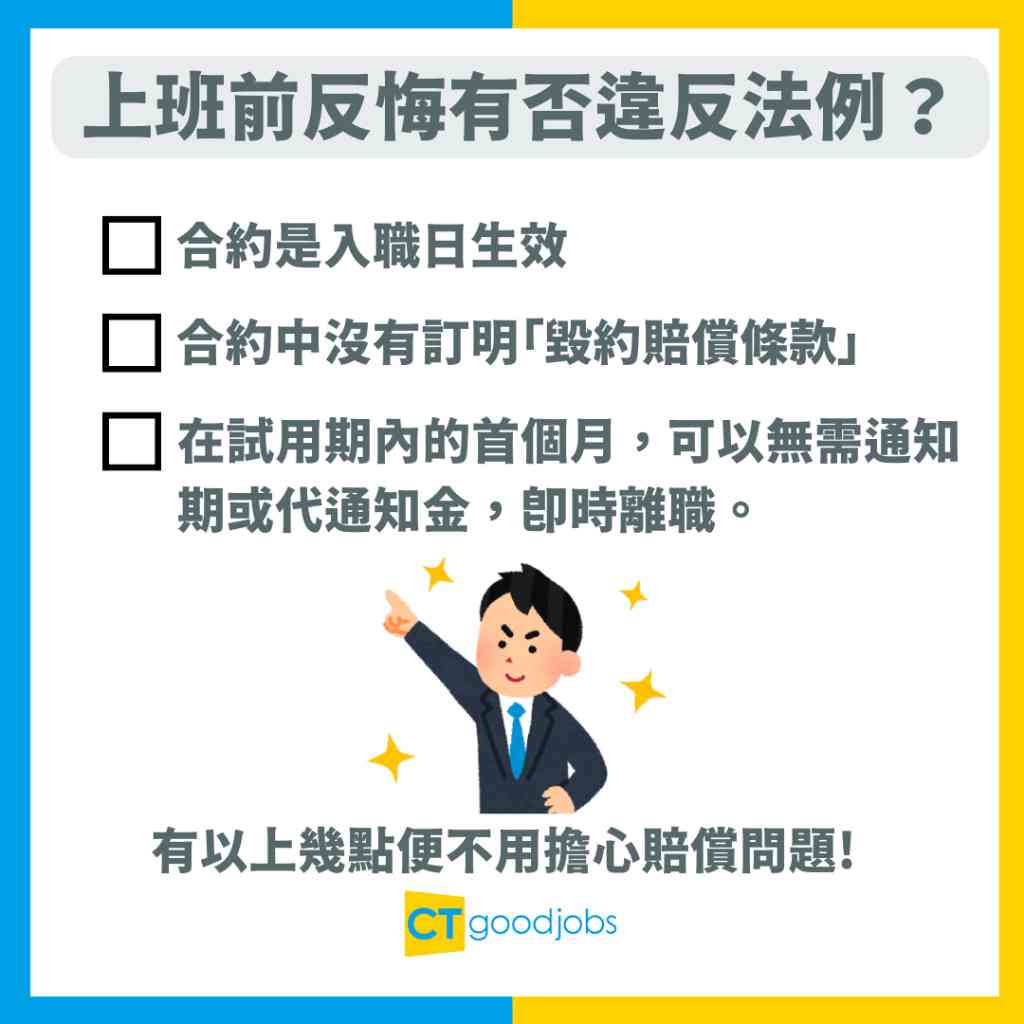 一般而言,僱傭合約會於上班第一日開始生效,如果你於此日期前向公司表示拒絕Offer,由於合約期仍未生效,所以公司不能逼令你支付代通知金。除非合約中有訂明「毀約賠償條款」、培訓費等條款。另外,僱傭合約有明文規定,在試用期內的首個月,可以無需通知期或代通知金,即時離職。