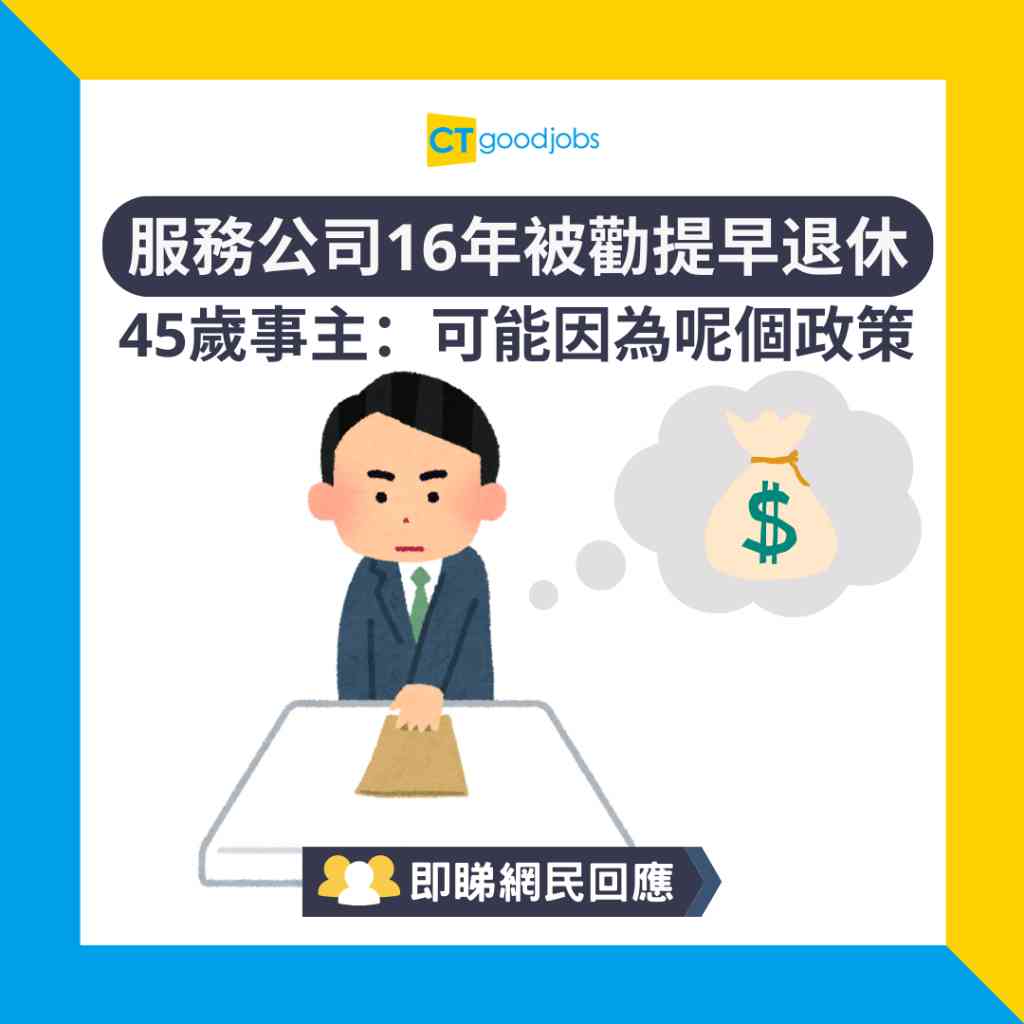打工仔如果願意在同一間公司服務多年,相信對公司也有一定感情,但是如果公司突然要求你提早退休,你又會有甚麼反應呢?有打工仔在社交平台專頁「奴工處」投稿指,最近被任職10多年的公司要求提早退休,他認為原因有可能是因為一個政策,更表示「希望喺同一間公司做得耐嘅朋友要有心理準備,亦祝願大家能夠順利過渡。」