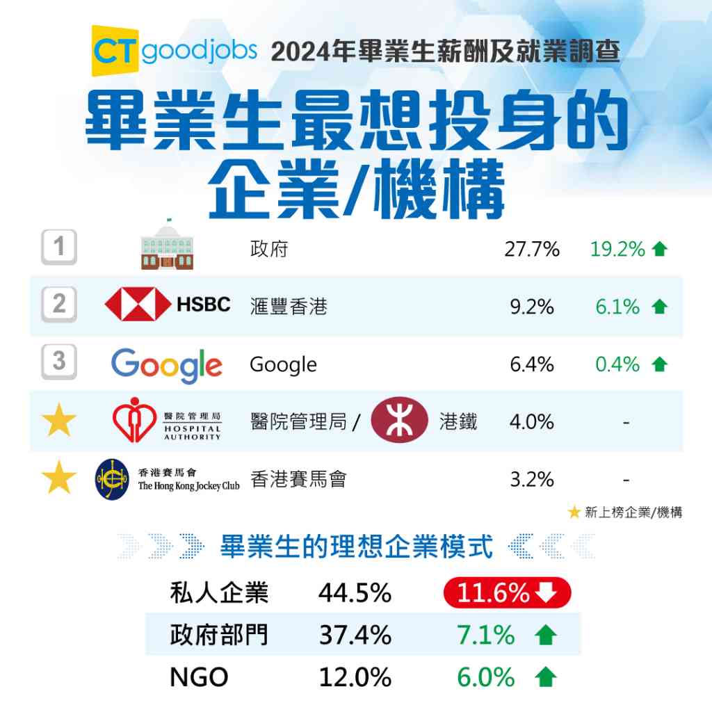 調查數據顯示,畢業生最想任職的企業/機構中,政府繼續蟬聯第一,比率達27.2%,較去年大升近兩成;其次為滙豐香港(9.2%)及Google(6.4%),去年排第4位的Apple則跌出榜外,取而代之的是新上榜的醫院管理局(4.0%)、港鐵(4.0%)及香港賽馬會(3.2%)。