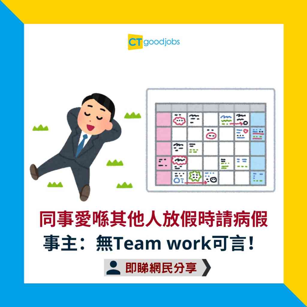 事主︰「話說我條Team有位同事,專揀其他人放年假嘅時候請病假,咁就唔使跟人哋啲嘢,放完假啲工作就原封不動交返畀人,真係毫無Teamwork可言!」