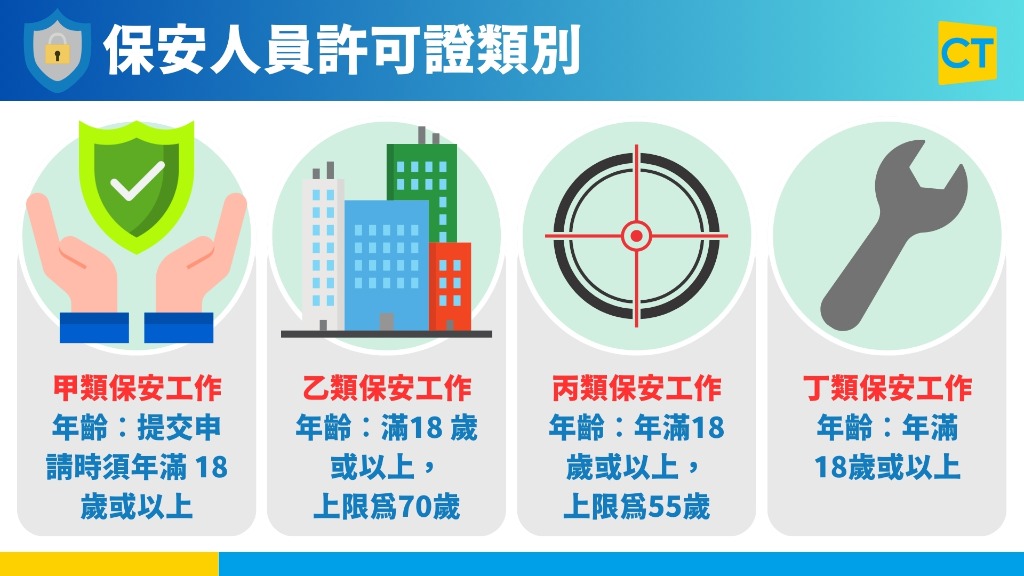 年齡︰須年滿 18 歲或以上。從事這類保安工作的年齡上限為 70 歲