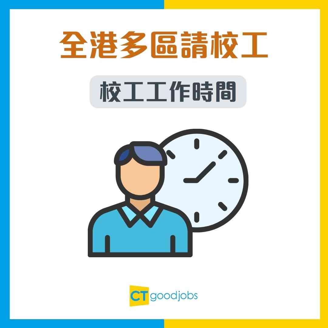 全職校工通常需配合學校開放時間,早更可能需於早上7時或7時半回校開閘,下午5時至6時放工。每週工作5至6天,部分學校實行長短週(隔週六休息)。相比起飲食業,校工極少需要落場或通宵,作息時間非常規律健康。