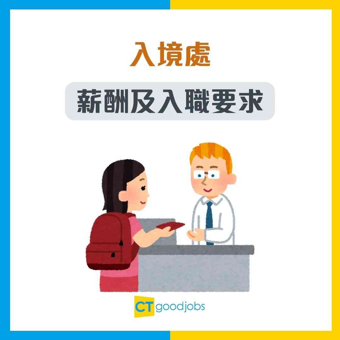 入境事務助理員屬員佐級,起薪約25,115元,學歷要求為DSE/會考五科第二級或以上,並重視體能及前線操作技能;而入境事務主任屬主任級,起薪由45,715至50,990元不等,須具備DSE三級或以上、大專或學位學歷,並需要通過CRE或相等語文要求,體能及甄選程序亦較多環節,職責偏向管理及專業執法。