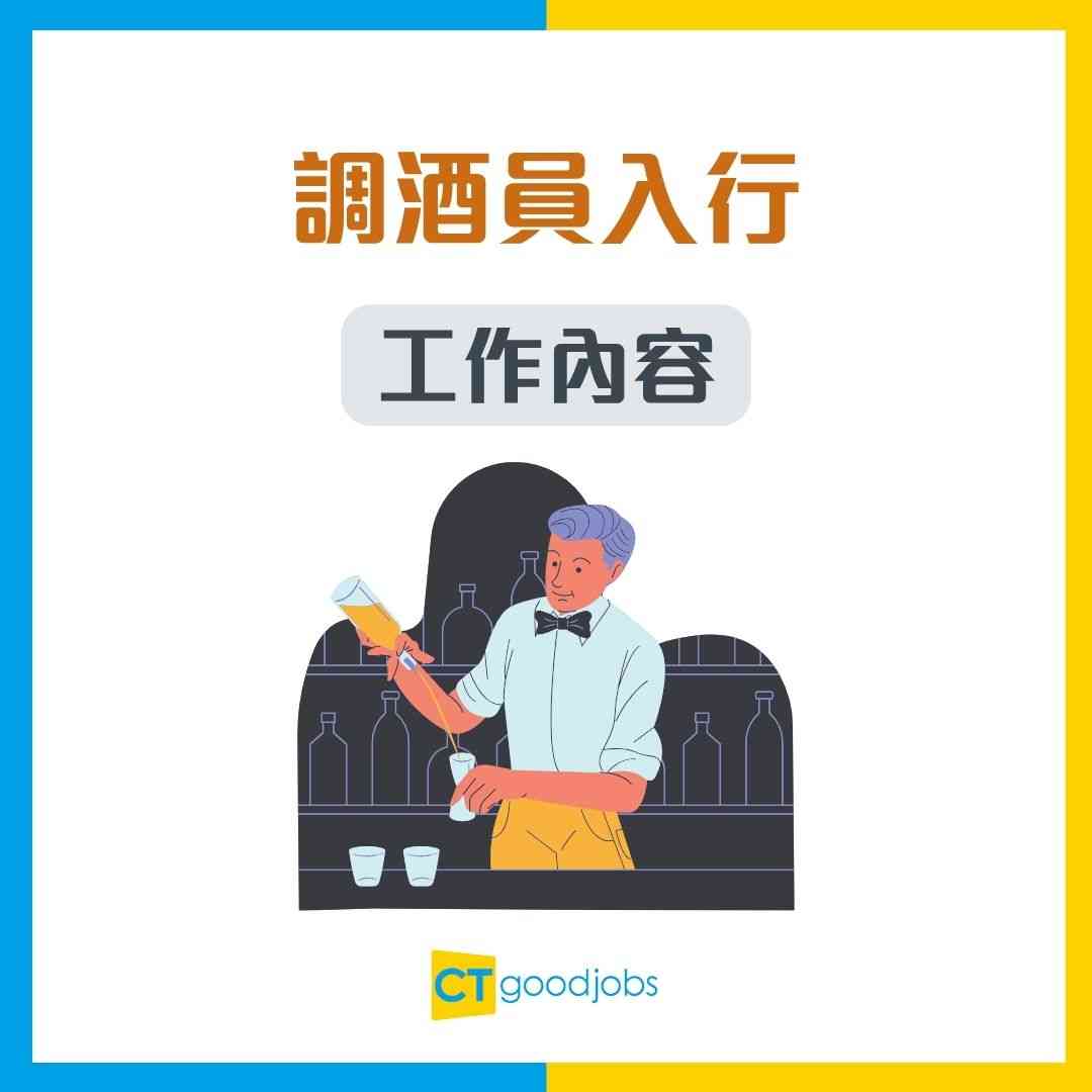 負責日常雞尾酒及飲品調製工作(搖盪、攪拌、直調、分層等技巧),調製雞尾酒、無酒精雞尾酒、經典雞尾酒及創意雞尾酒,操作和監察調酒設備(搖酒器、吧勺、量注器、冰夾等),監控飲品品質及環境衛生,協助酒類落單、庫存及供應管理。與客人聊天,甚至聽客人心聲,打好關係;了解客人飲酒的品味,按照客人喜好調出靚酒;為客人推薦飲品,提供酒類資訊。主管或以上職位需要管理整個吧檯運作流程、安排人手調配及培訓員工、研發及改良新飲品。