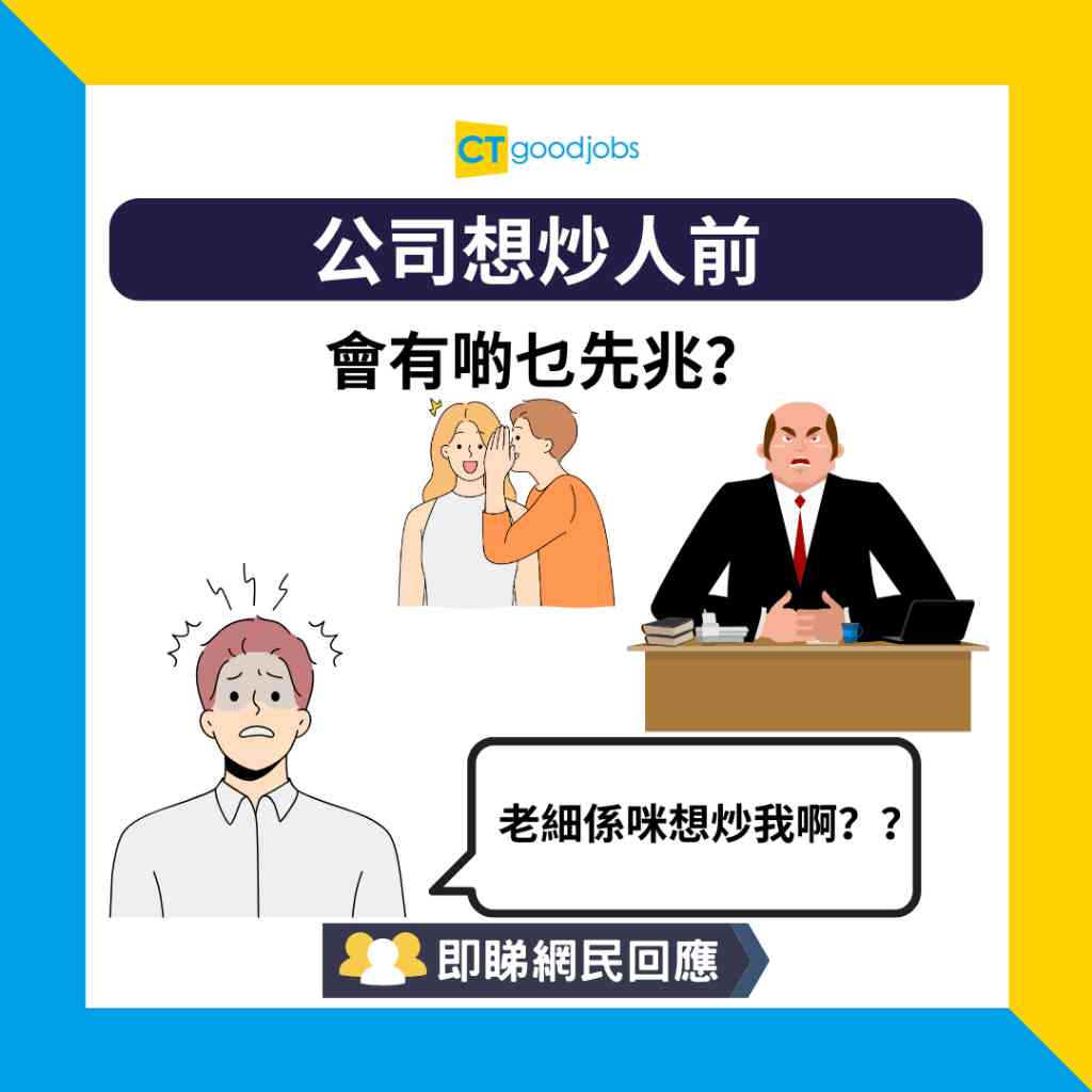 大部分網民都指出面臨解僱前,上司及同事的行為都相當明顯,例如減少與你交流、上司不敢正視你、對你工作表現突然過於挑剔,或大減工作量使你無所事事等,都是解僱前的先兆。倘若打工仔遭到解僱亦無需自責,要明白這只是職場生涯必經的階段,不需過於介懷,日後必定會有一份分更適合你的工作出現。