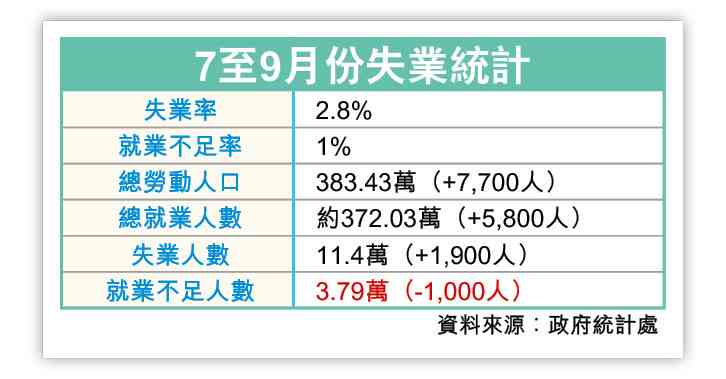 總就業人數由6月至8月的371.4萬人,上升至7月至9月的372萬人,增加約5,800人。同期的總勞動人口亦由382.6萬人上升至383.4萬人,增加約7,700人。
