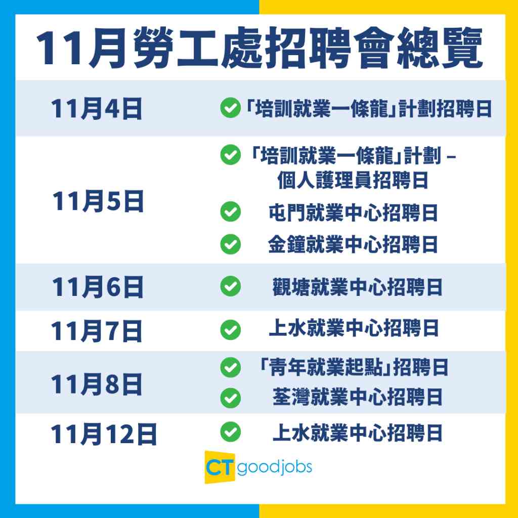 勞工處已宣布於2024年11月內至少會舉辦11個招聘會,正在求職的人士不能錯過!CTgoodjobs編輯部整合了一系列的招聘會資訊,讓求職者只需閱讀此文便可得知心儀職位資訊,更快獲得理想工作。