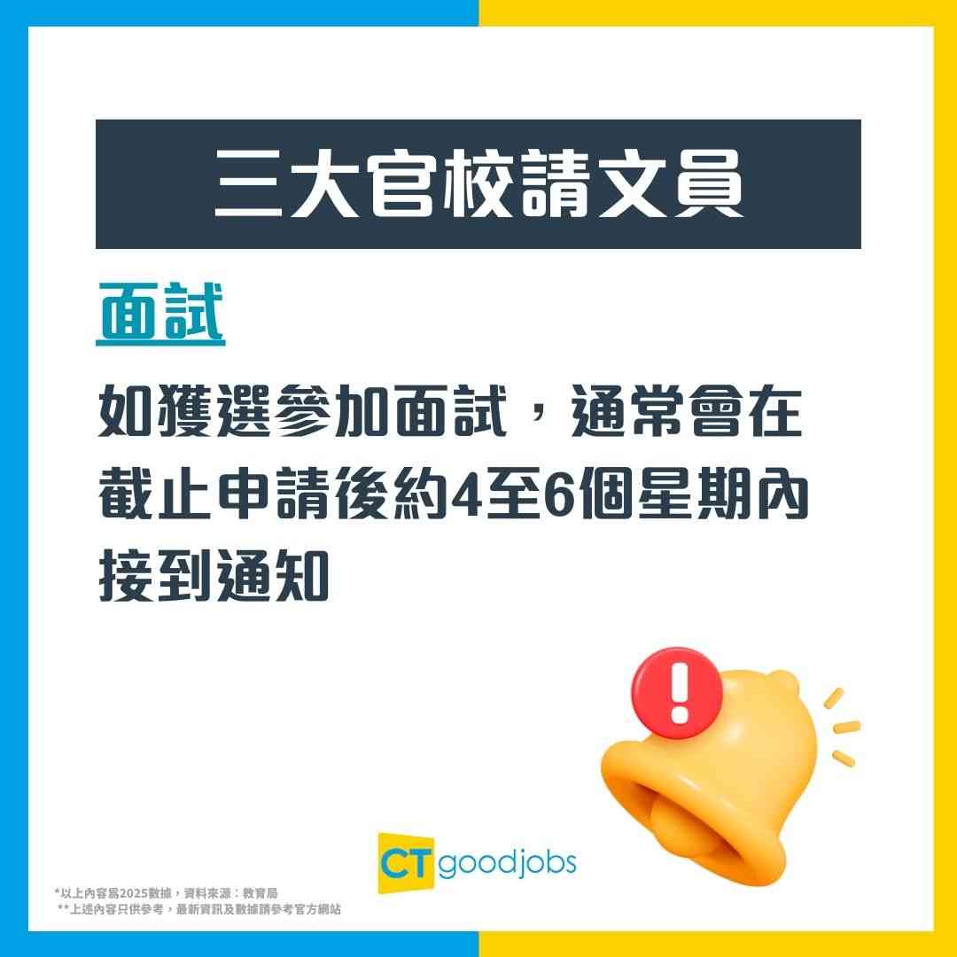 (4) 申請人如獲選參加面試,通常會在截止申請後約四至六個星期內接到通知。如申請人未獲邀參加面試,則可視作經已落選。有關上述空缺的資料,可直接致電向招聘學校查詢