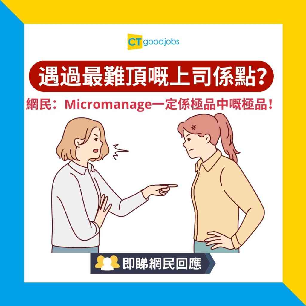 網民不約而同地認為奉行微觀管理(Micromanagement)的上司非常難應付,因為他們習慣每件事都要插手,而且過度掌控員工。這樣的管理方式不但限制了下屬的發揮,而且會影響他們的成長,令他們缺乏信心,長遠而言會打擊團隊士氣,降低工作效率。大家身邊又有沒有微管理的上司?如果不幸遇上他們,你們又會如何應對?