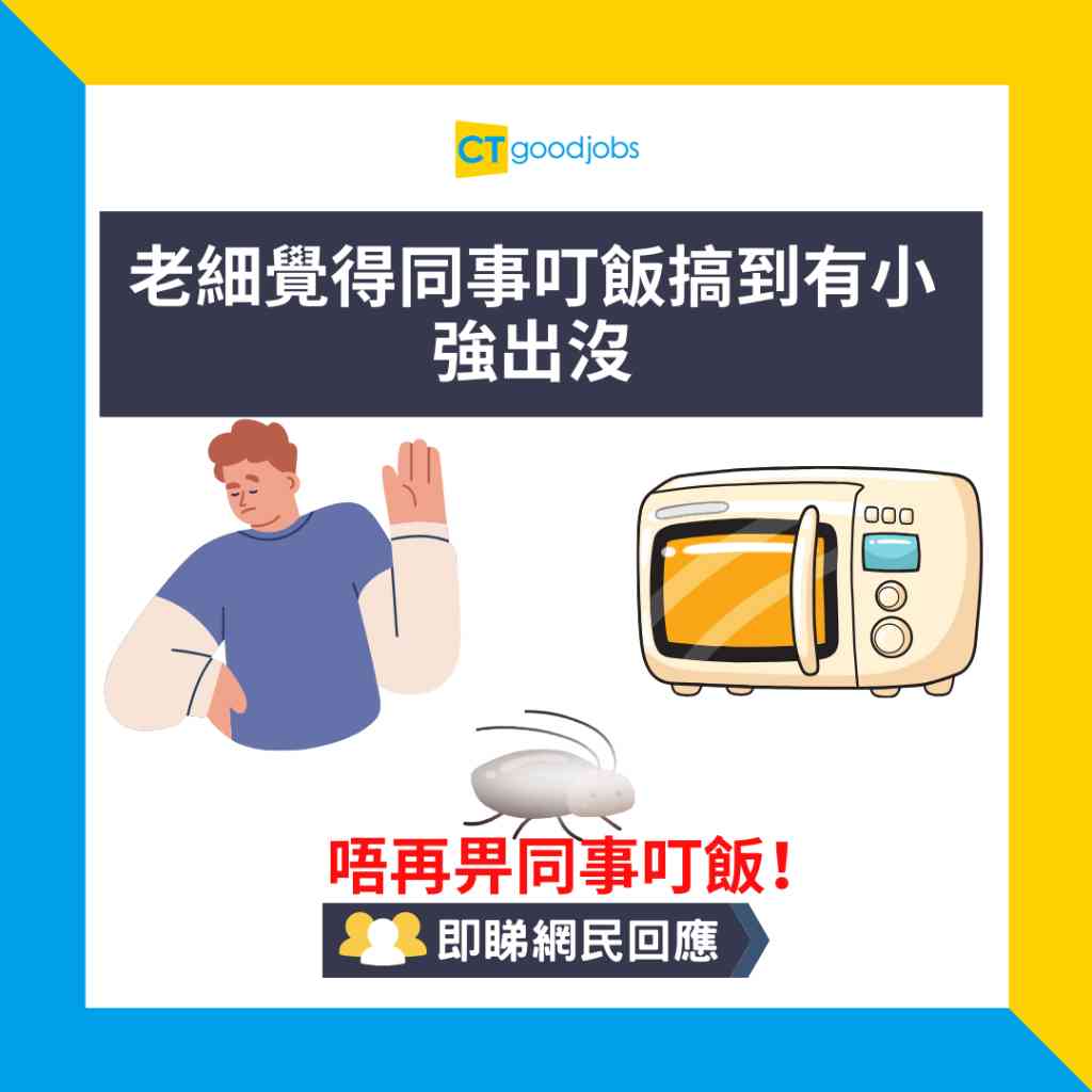 不少打工仔有時為求減省日常開支,都會帶飯到公司享用。不過,若然有公司突然禁止員工叮飯,打工仔又可以怎樣做?近日,有網民於香港討論區發文,指老闆因為發現有小強在公司出沒,因此禁止員工在公司叮飯,令到事主及同事感到相當無奈……